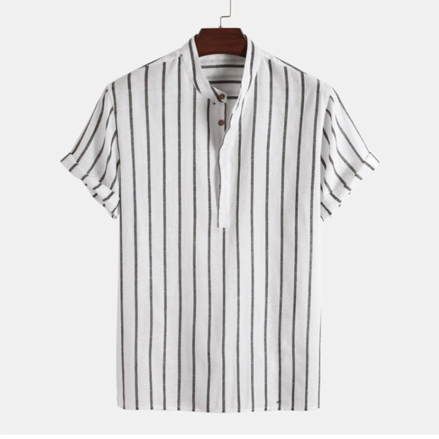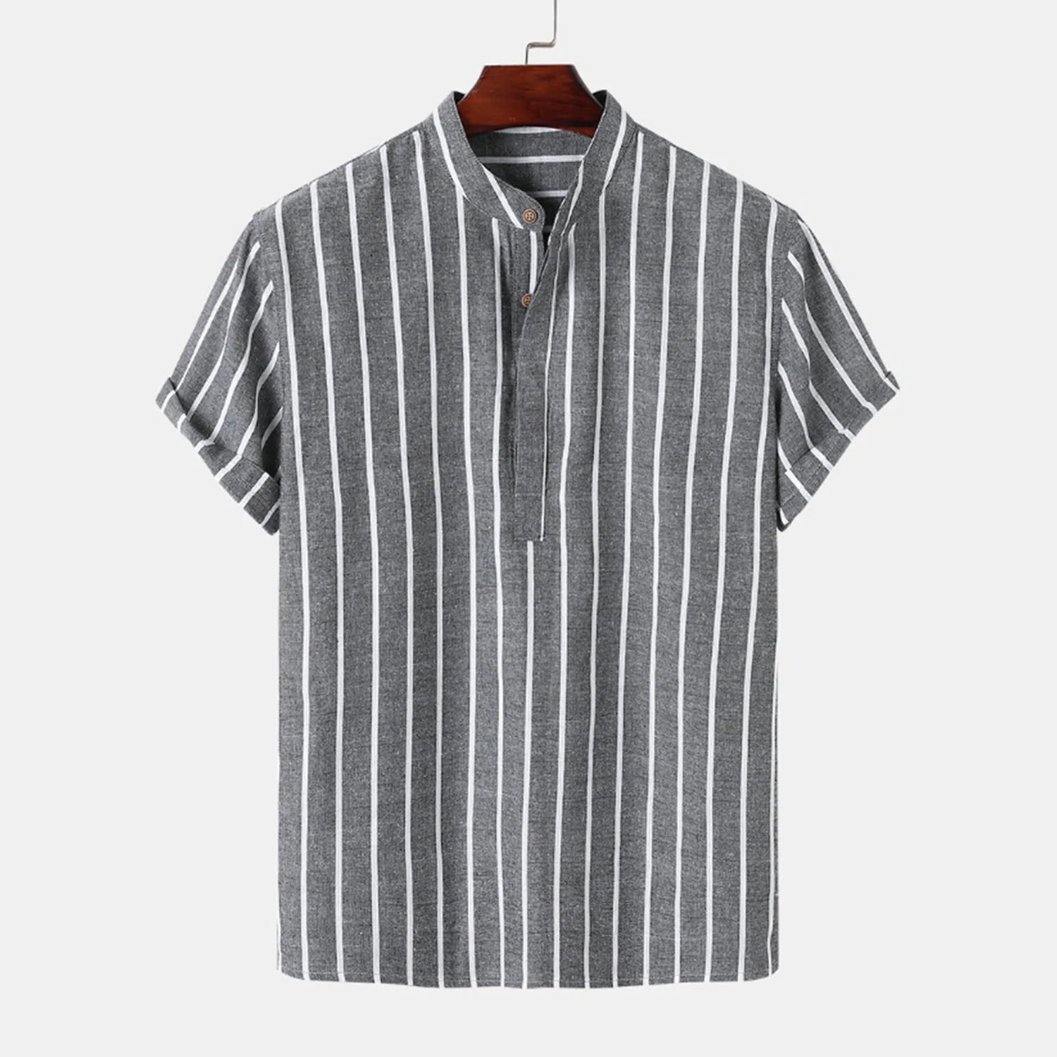 Cotton Linen Shirt Men's Summer Short-sleeved Striped Shirts Solid Color Turn-down Collar Casual Beach Style Blouse Top Pullover