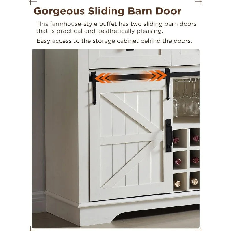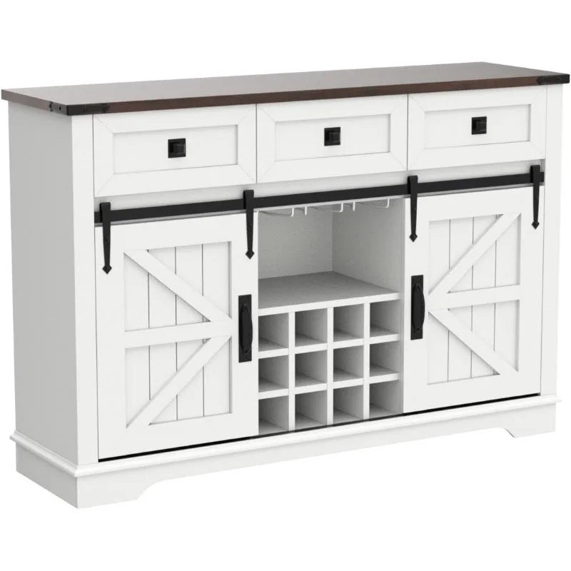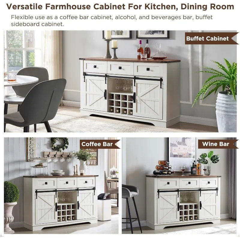 OKD Farmhouse Buffet Cabinet, 54" Coffee Wine Bar Cabinet w/ 3 Drawers, Sliding Barn Door, Wine & Glass Rack