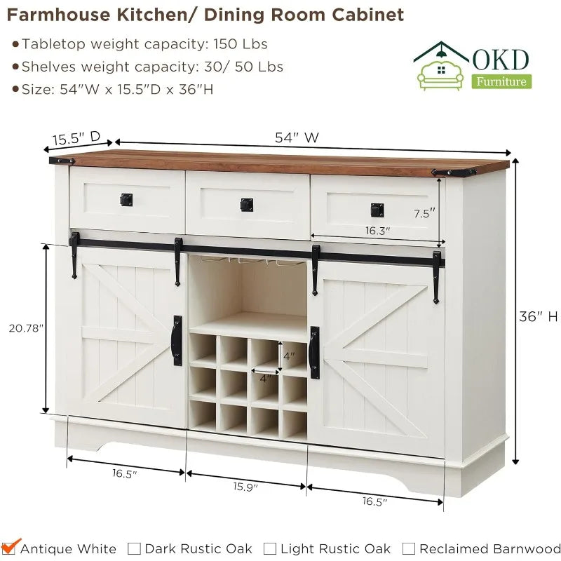OKD Farmhouse Buffet Cabinet, 54" Coffee Wine Bar Cabinet w/ 3 Drawers, Sliding Barn Door, Wine & Glass Rack - Dark Rustic Oak / United States / VIP Price is backordered and will ship as soon as it is back in stock.